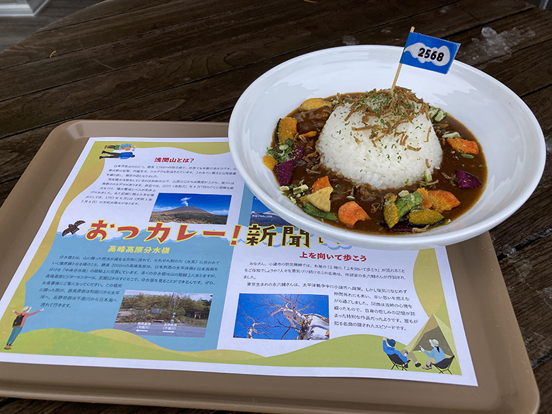 ガトーショコラをお求めの方には、「おつカレー!100円割引券」をお渡しします。下山後には、あたたかいビジターズカフェでほっと一息つきながら、浅間山のかたちをした、美味しいビーフカレーをお召し上がりください。